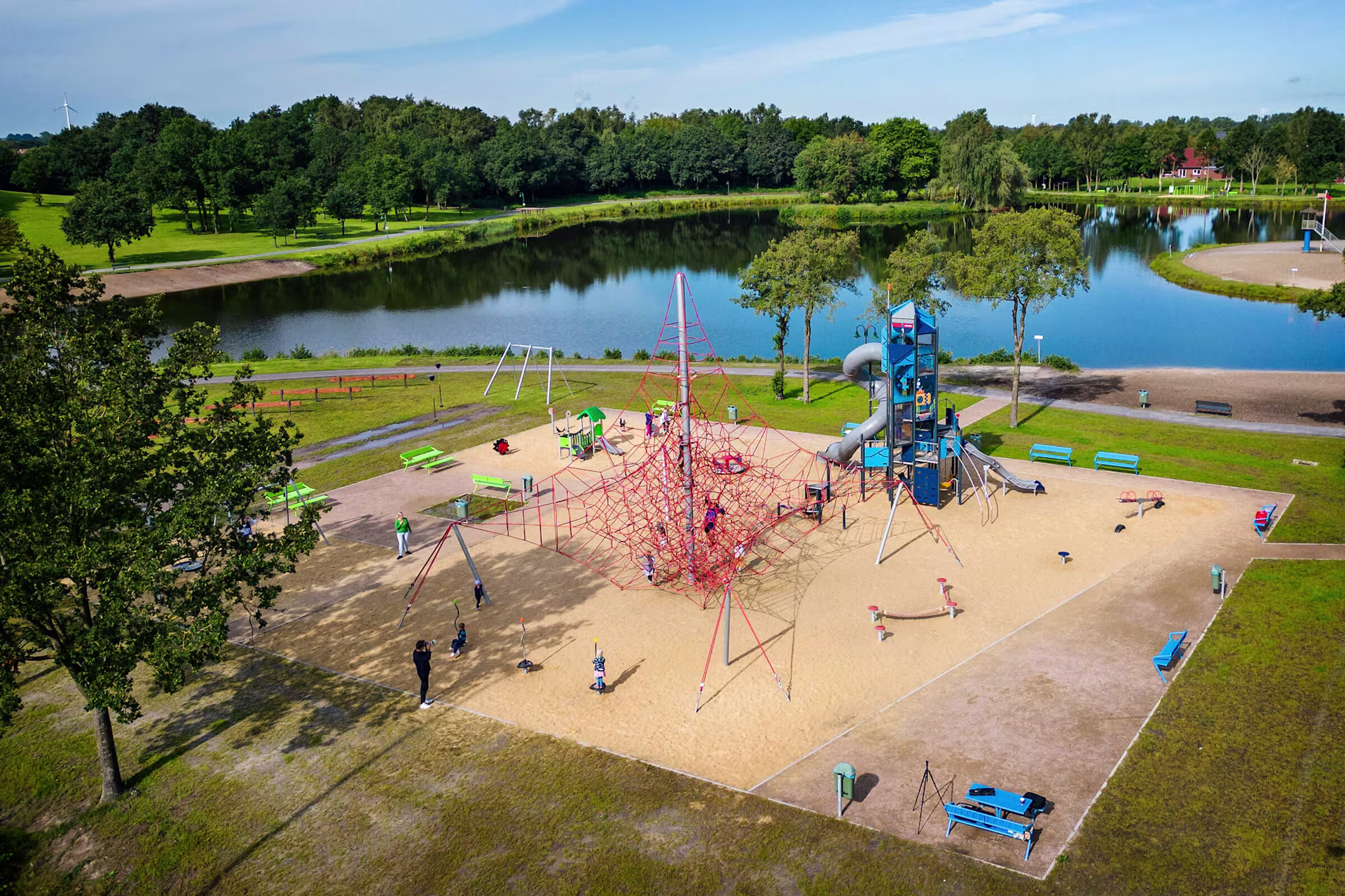 Das großzügige Netz bietet zahlreiche Spielmöglichkeiten und lädt Kinder zum Klettern, Balancieren und gemeinsamen Entdecken ein. Dabei werden Motorik, Koordination und das Miteinander gefördert. Verschiedene Ebenen und Herausforderungen sorgen dafür, dass alle Kinder mitmachen können. Unter dem Netz gibt es gemütliche Plätze wie eine Hängematte, die zum Ausruhen oder Schaukeln einlädt. Elemente wie herabhängende Seile oder eine bewegliche Kugel regen zum gemeinsamen Spiel an. Die Rutschmembran sorgt für Spaß und trainiert Rücksichtnahme und Teamgeist. Wer ganz nach oben klettert, genießt den Ausblick und ein echtes Erfolgserlebnis. Die Cocowave-Schaukel neben dem Netz fördert das Zusammenspiel und macht das Erlebnis komplett.