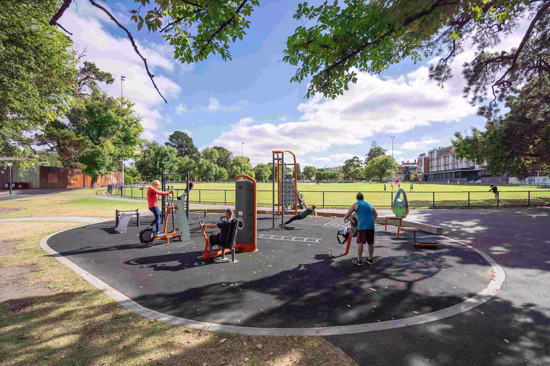 KOMPAN provided an outdoor gym with a variety of , , , and equipment. This creates a workout space suited to everyone, providing an inclusive environment. The quality of KOMPAN’s equipment is unmatched and comparable to that of indoor gym facilities, as it is made from high-quality, long-lasting materials. The offers adjustable resistance loads to support workouts for all fitness levels. Located next to , it allows both parents and children an area to work out and burn energy.