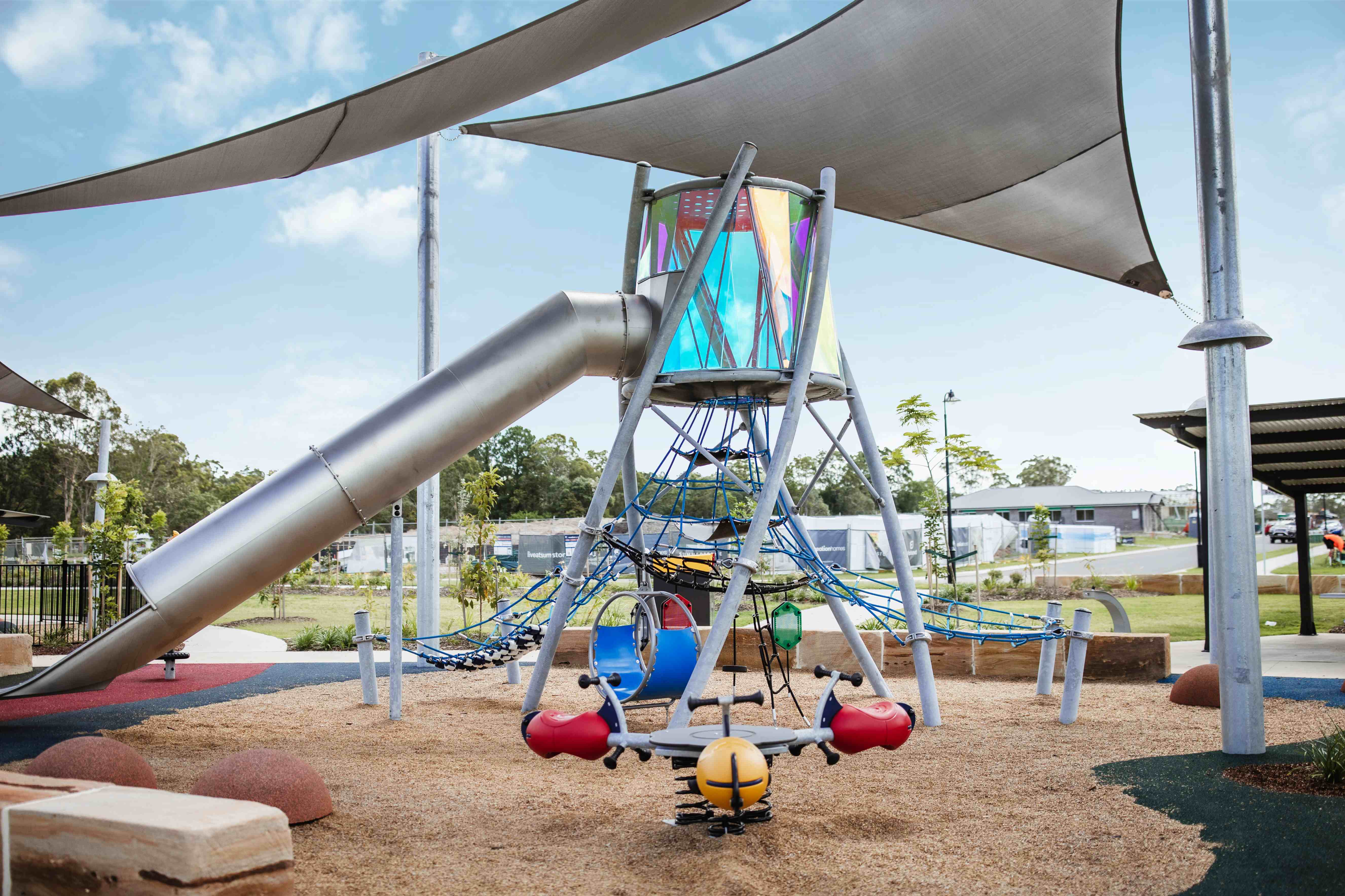 The large netted landscape is filled with play activities. Climbing around the net exercises children's arm, leg and trunk muscles and develops their balance, coordination and spatial awareness. The generous space and transparency of the net encourages social play and co-operation. There are also plenty of places to take a break together or on your own, such as the lookout tower or the black rubber membranes. Activities of varying difficulty, at different heights allow all children to participate in the play. Under the net there are several activities at ground level such as a hammock that serves as both a resting place and a swing. Vines hanging down and a ball rattling are influenced by the play above and promote playing together no matter where you are.