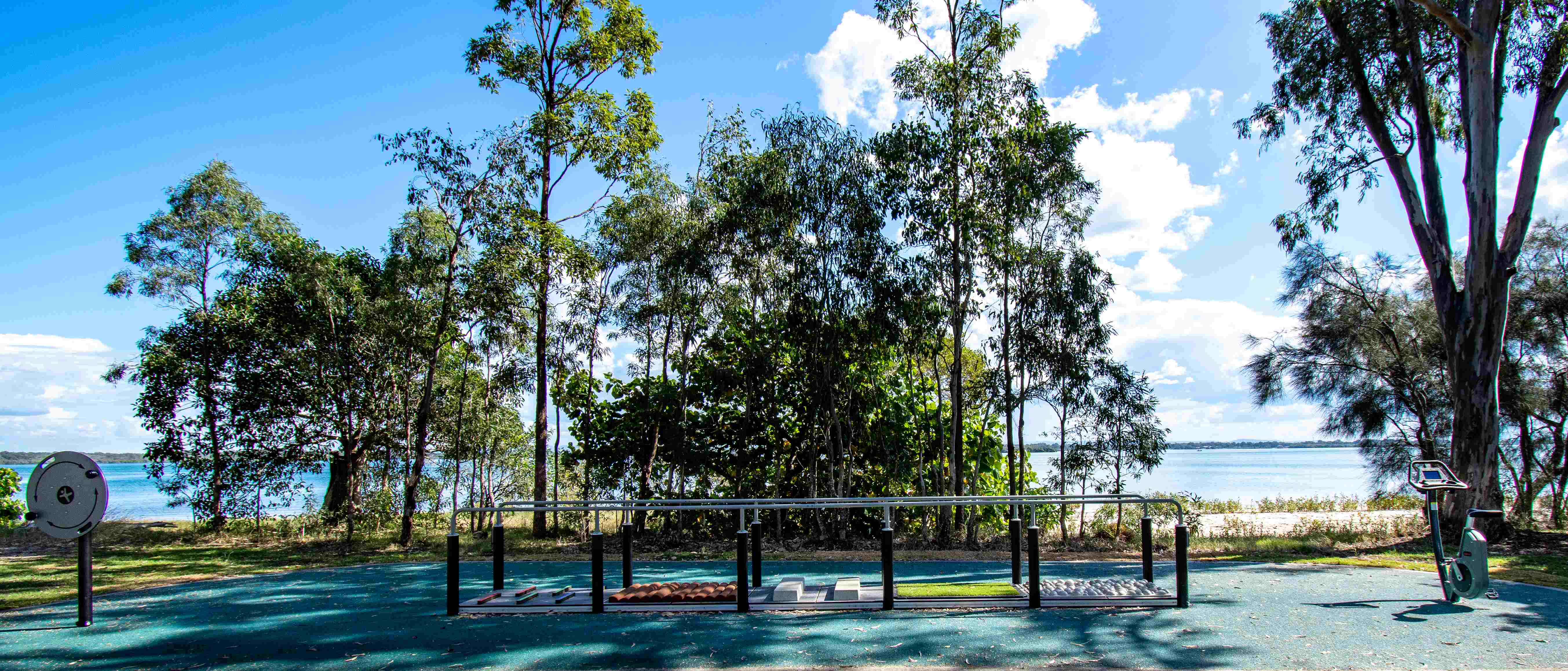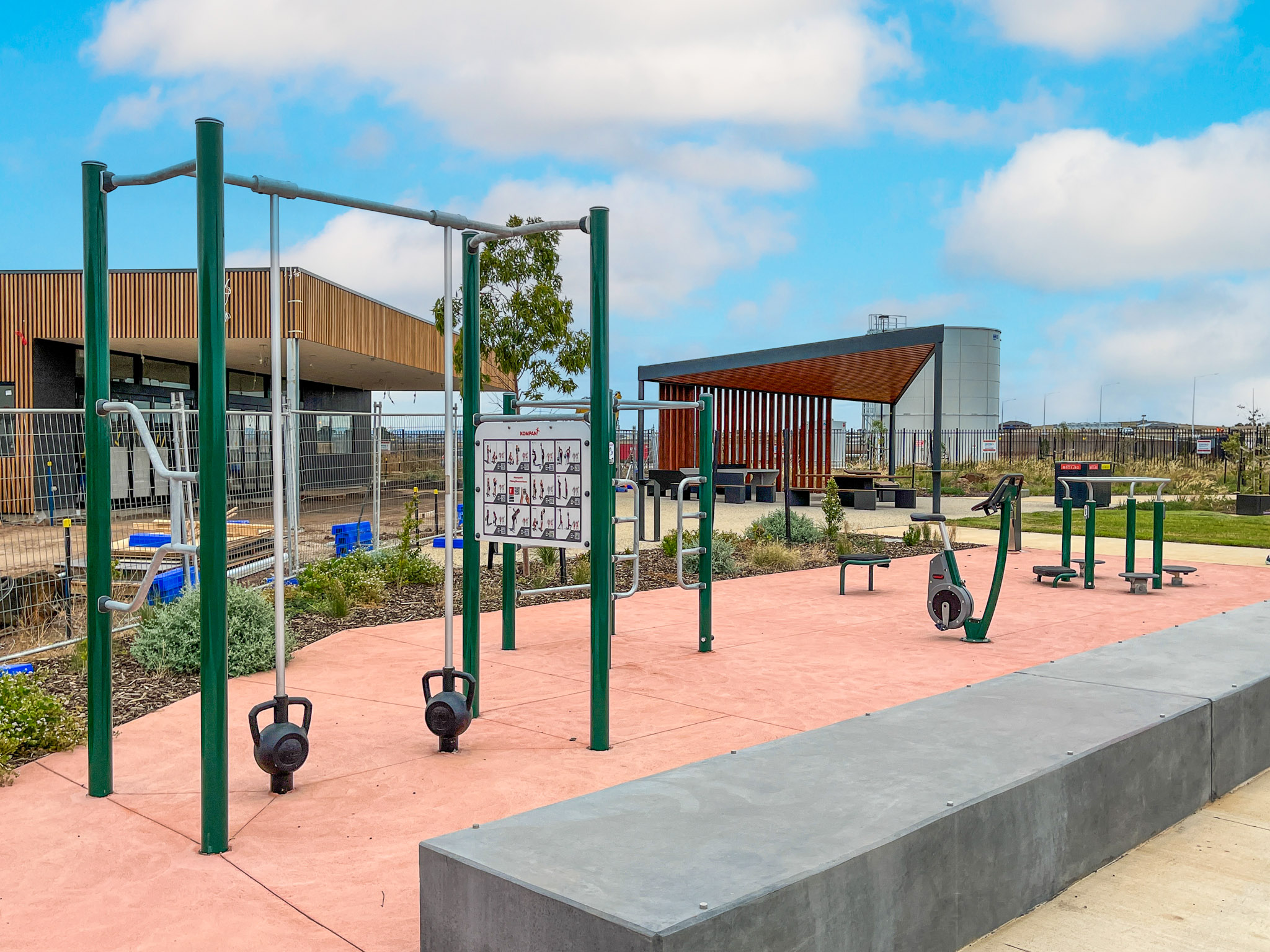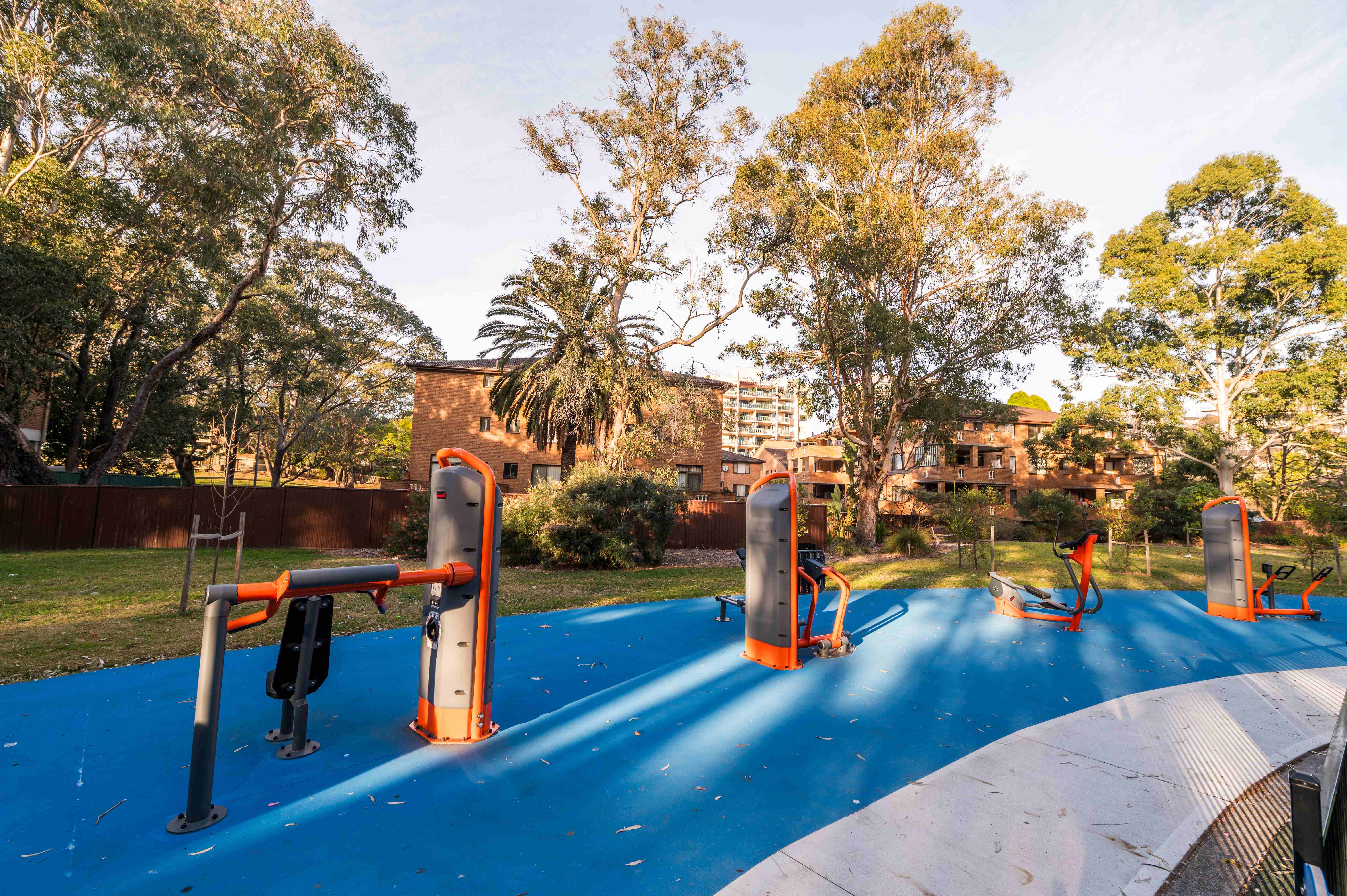 You will also find a workout pentagon set, dip bench equipment, two bars at various levels for push-up exercises, three parallel bars, a set of four steps at different heights and a bike rack.