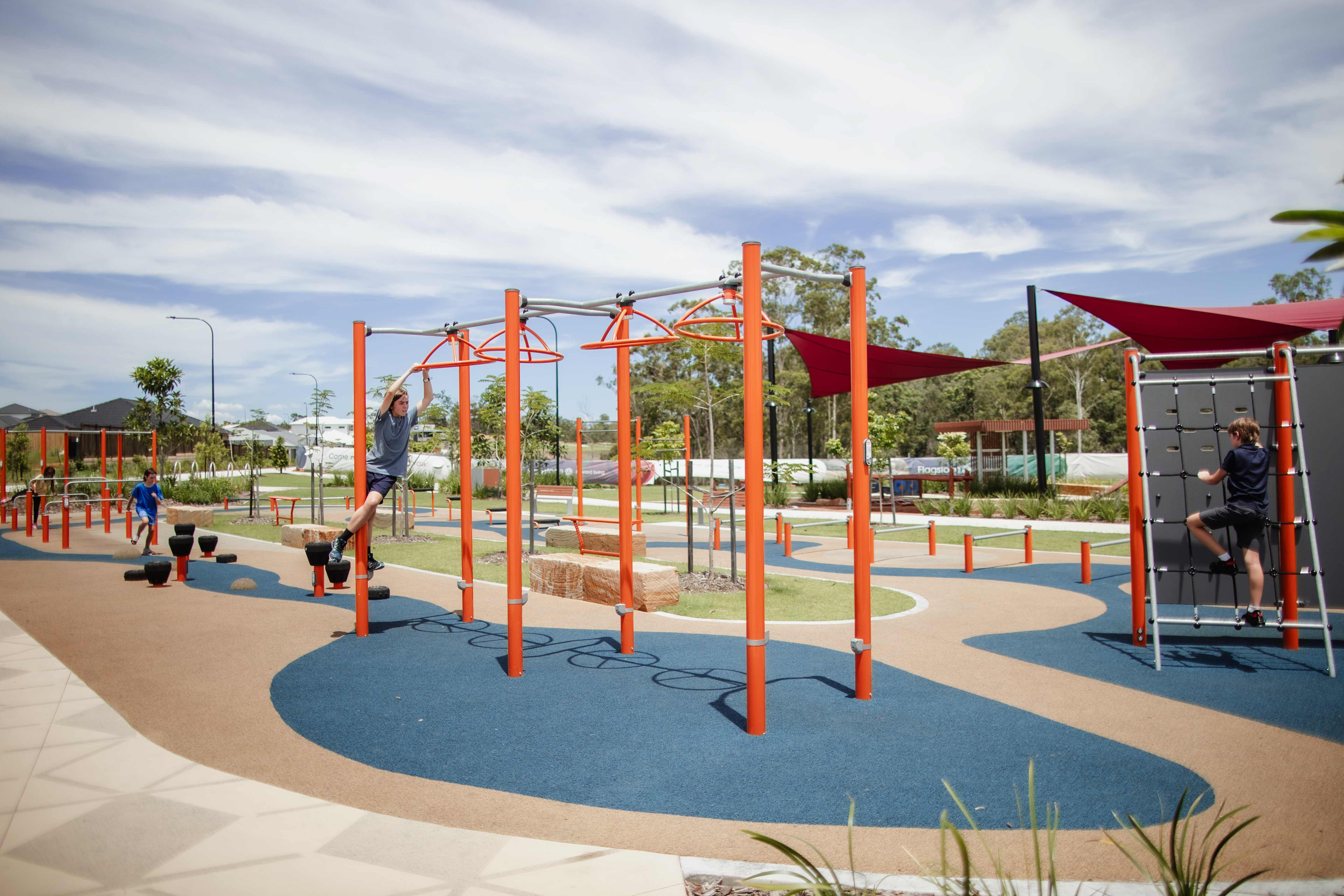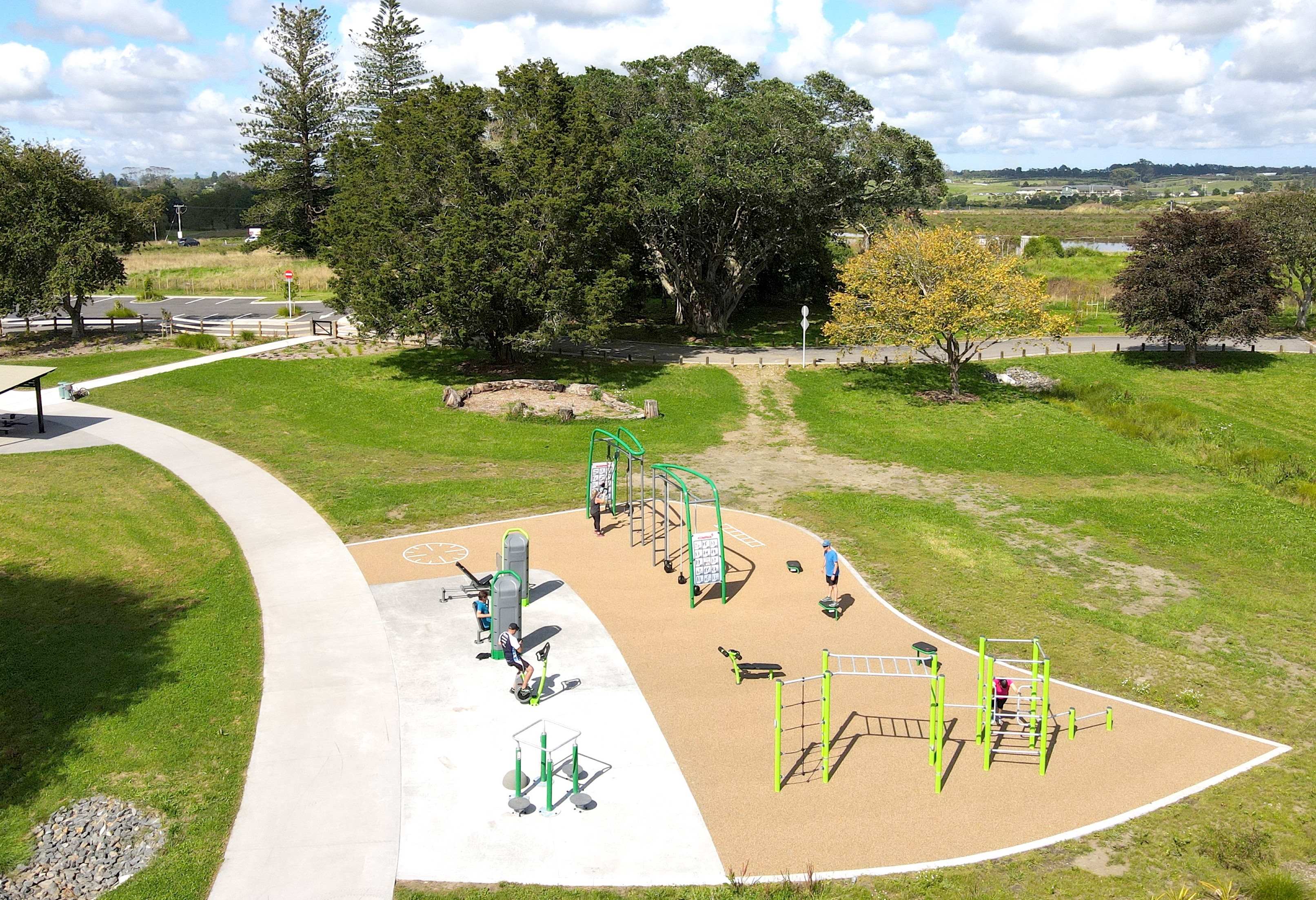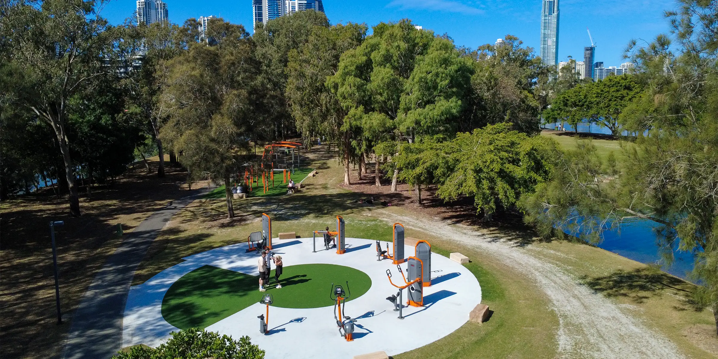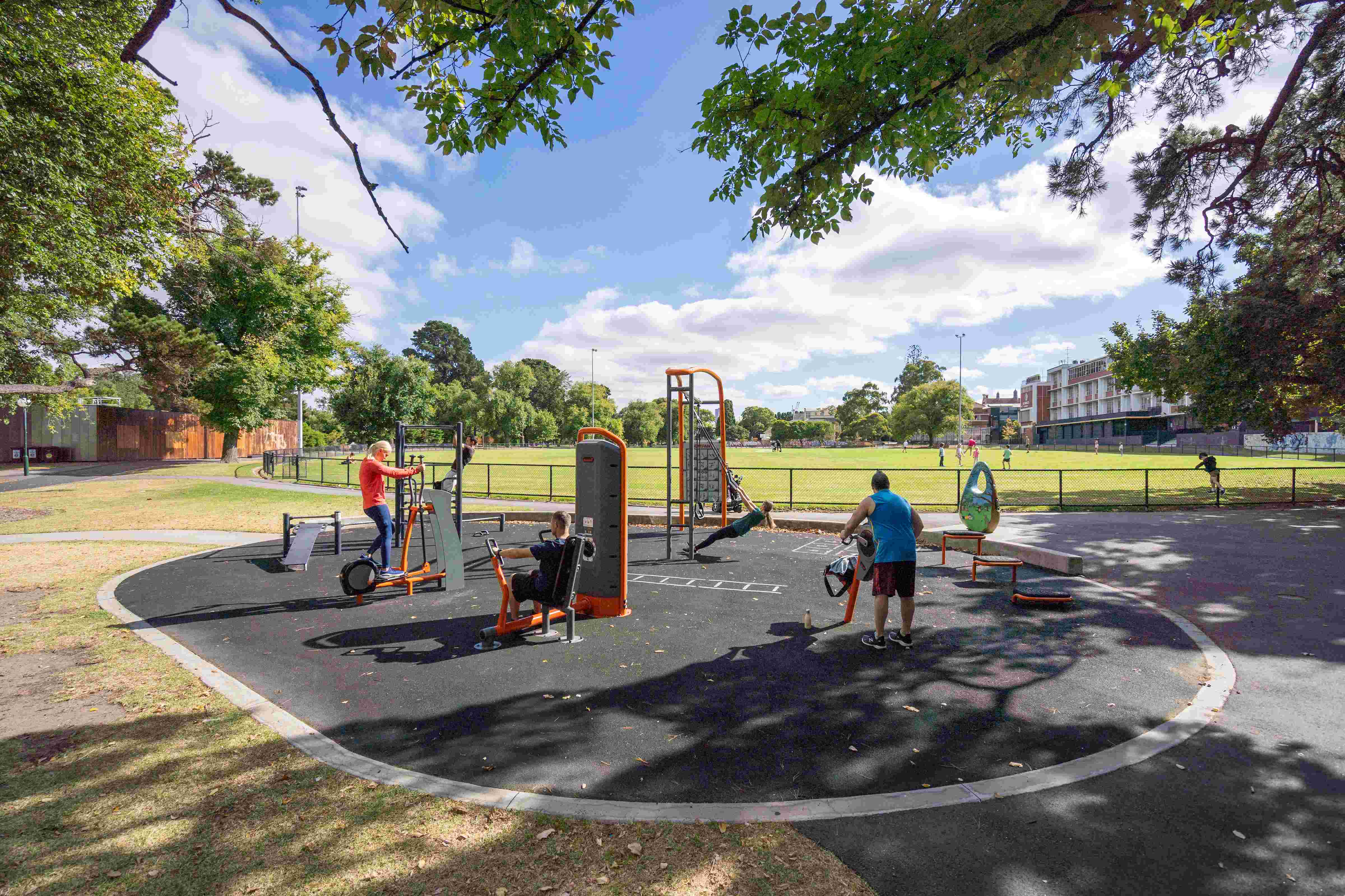 You will also find a workout pentagon set, dip bench equipment, two bars at various levels for push-up exercises, three parallel bars, a set of four steps at different heights and a bike rack.