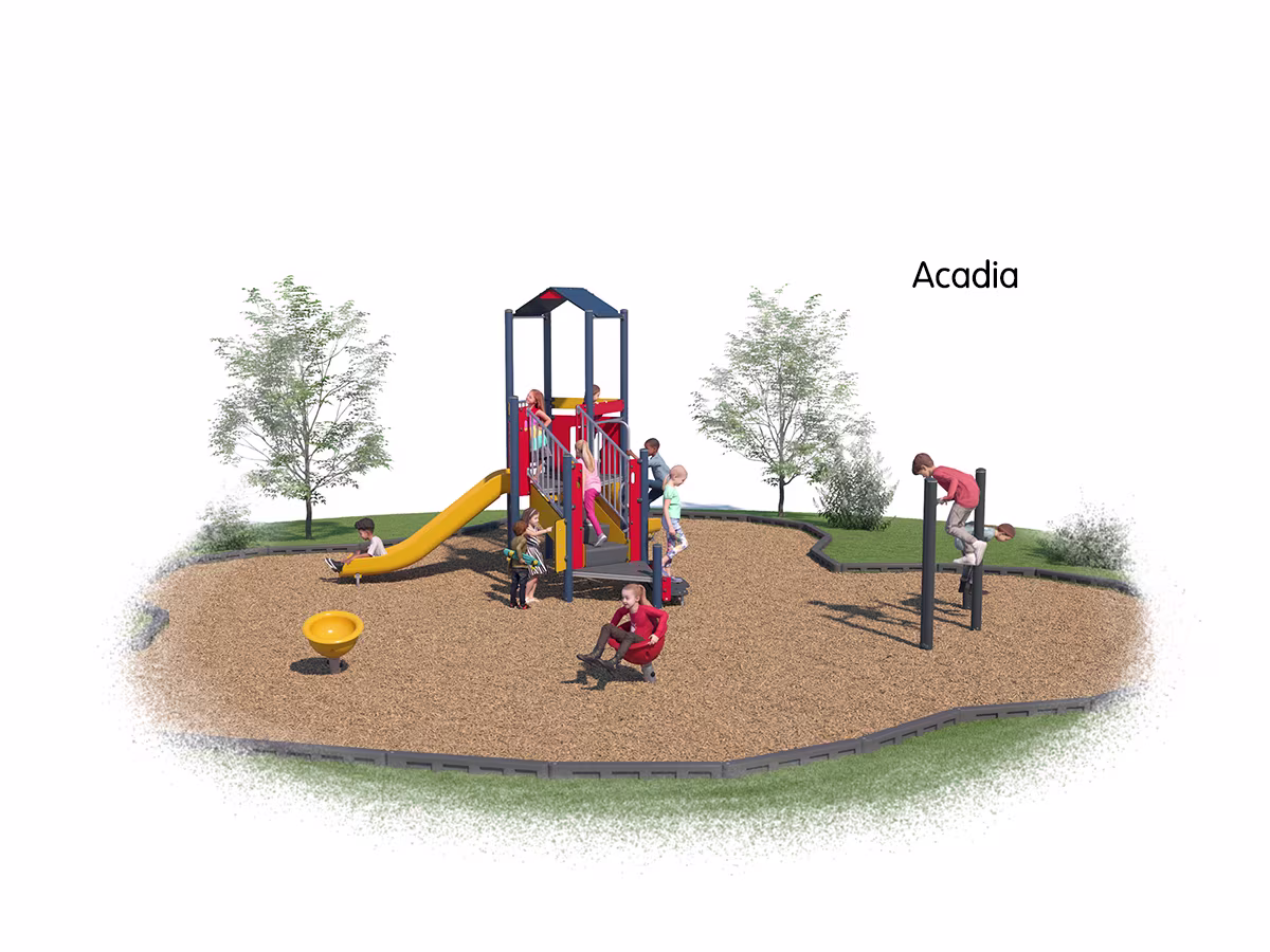 Loaded with play value in a compact space just over 500 square feet, the Acadia Package is accessible and motivating for all ages. Children can climb the stairs or the climbing pole then take the slide to develop trunk stability and a sense of balance. The upper level provides the perfect meeting point with friends, as well as a vantage point of the play space below. With the addition of our wildly popular Spinner Bowls and Double Somersault Bars, this option offers a total package.