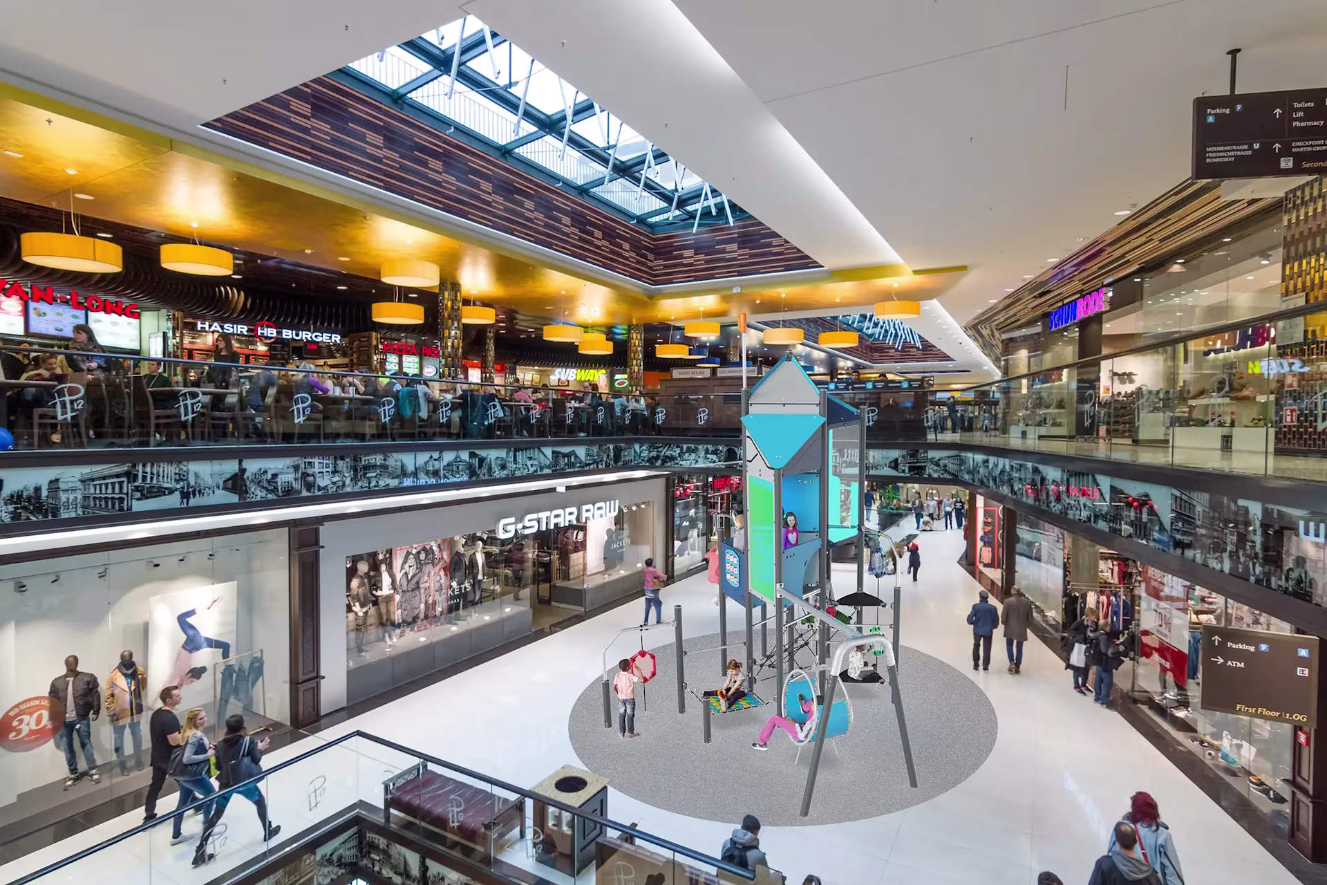This innovative design was created with one goal in mind: to introduce a landmark attraction that draws families and new visitors to the shopping centre. The striking playground structure not only enhances the shopping experience but also increases stay duration, driving more traffic to shops and restaurants. Strategically placed in front of restaurants and benches, it allows parents to relax while keeping an eye on their children, who can fully immerse themselves in the excitement of our XL play structure.