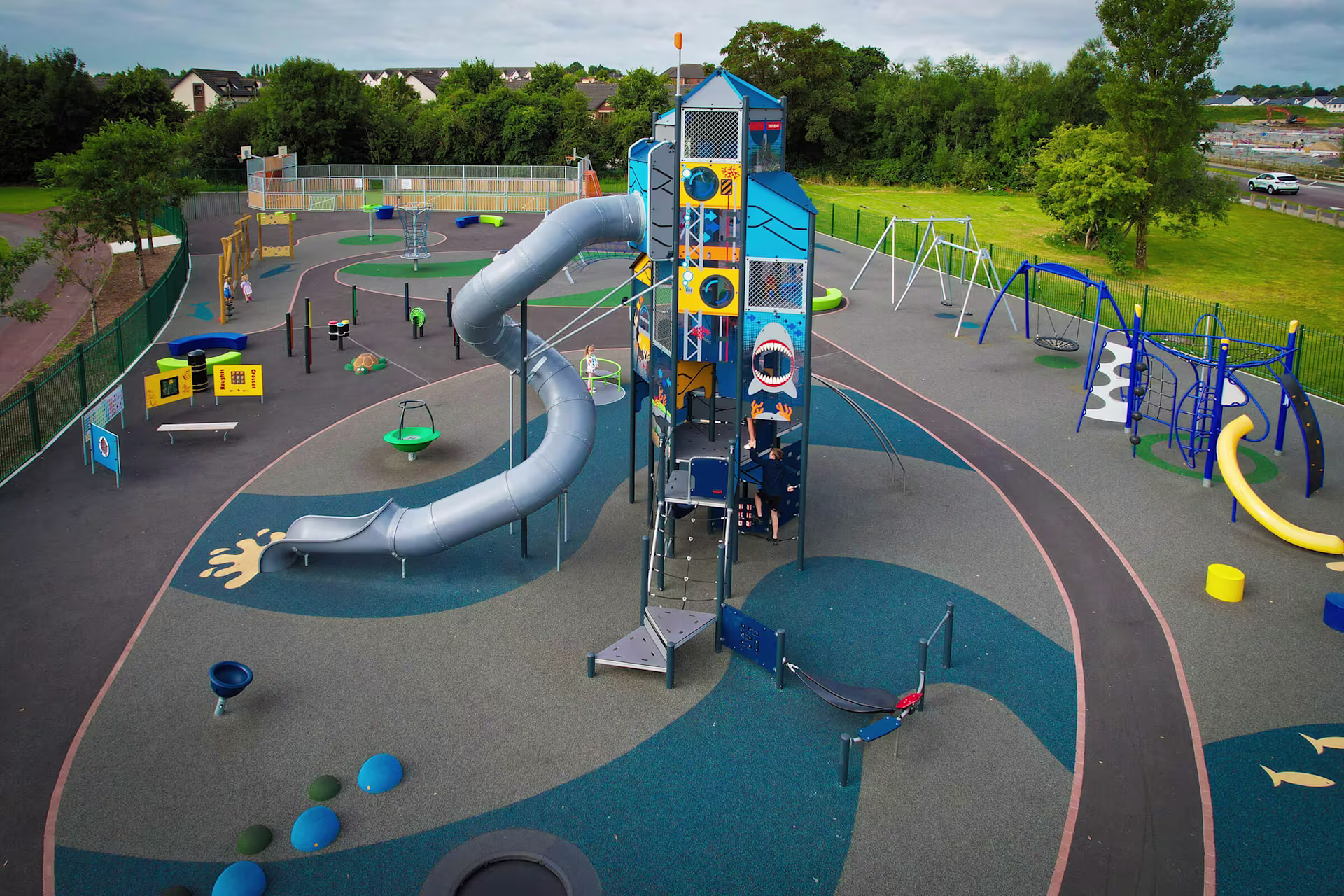 The customer required a modern robust play area with high play value that encourages intuitive and natural free play. As well as providing play equipment with high play value for toddlers to teens it was important to create natural free play areas. We carefully chose equipment that would create movement, social and challenging play. The result is a modern play area that provides children of all ages an exciting play space that will provide hours of fun!