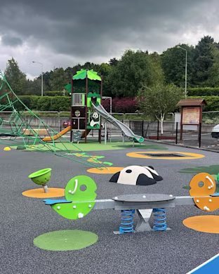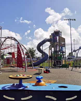 If you pass by Ramsden Park at mid-day, you will find it packed with families. The park's new playground has play zones that offer age-appropriate play for all children. Located in the middle of the playground, the large customized Corocord tower is the draw for the older children. Climbing through its infinite net of ropes offers a fun challenge that has the ultimate reward of a fast trip down the slide. Leading up to the Corocord tower are long tracks of agility nets that offer vertical climbing and intense development of balance and coordination skills. Various springers and seesaws with playful designs will give children of all ages hours of rocking fun, either alone or with friends. The Supernova offers a fun challenge for older children looking to take spin with friends.