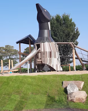 They ended up with multigenerational activities made up of three play areas for children, and sports facilities for adults. The centerpiece is a 7-metre-long train full of fun activities such as a rope tunnel, a firefighter pole and control panels with handling elements.