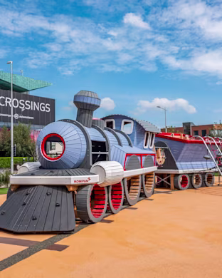 The installation of the play train refers to the historical past of the city, at the time of the industrial revolution and the construction of major infrastructures.