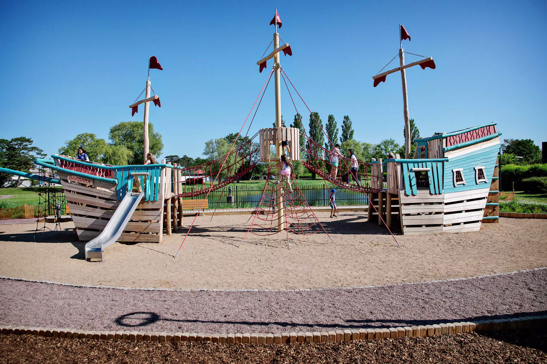 Families with children in Frederiksberg can now enjoy a new playground in the Fuglebakke neighbourhood. Here, children can use their energy on a wide selection of exciting play equipment. The playground's division into smaller 'play zones' gives encouragement to explore many different play opportunities. From activities such as playing on trampolines, swings, slides and spinning equipment to sand play at the playhouse or role play in the impressive 5.8 metres tall observation tower, the playground has something to offer children of all ages.