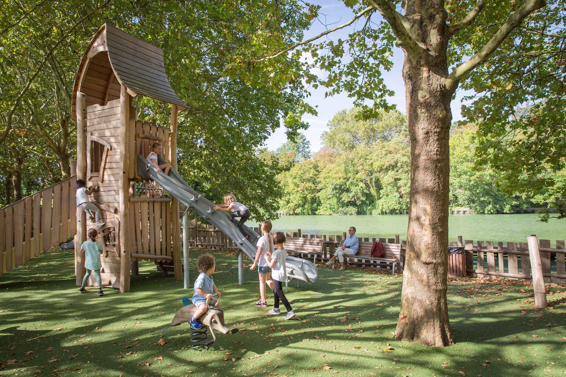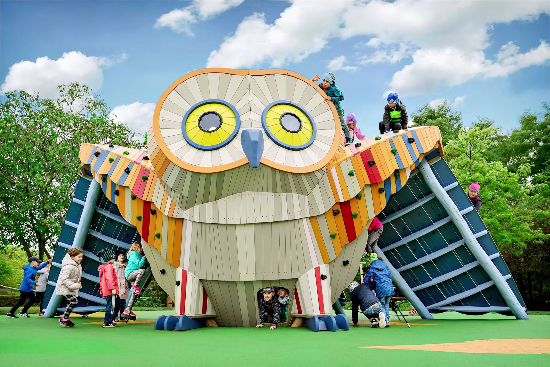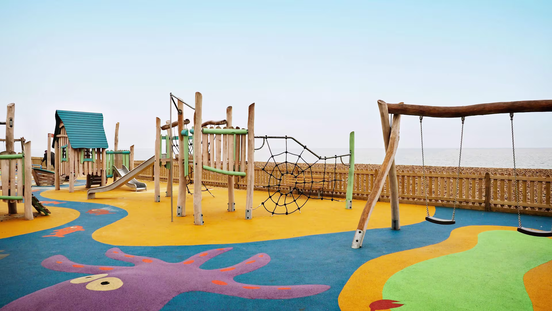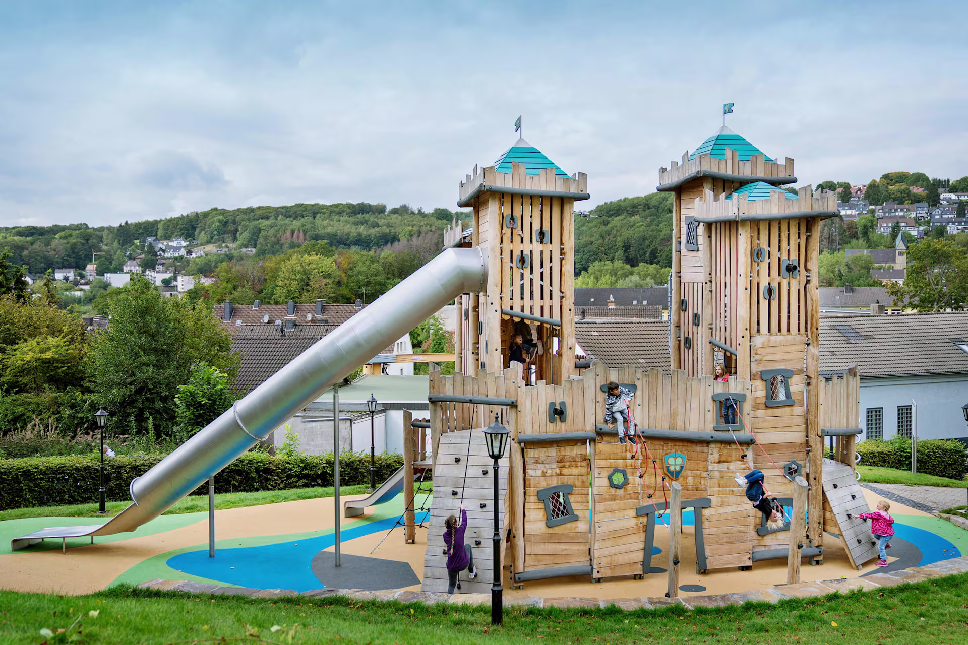 In addition to being an entertaining play universe, the playground's universal design also fulfils the requirements for inclusion. This means that children with disabilities can move around the space effortlessly thanks to its surfacing and choice of play activities such as spinners, swings and sandpits that support different body postures and needs. In addition, the observation tower's walkway, as well as the wide distance between play zones, enables easy access for both wheelchair users and parents with prams and pushchairs. See more examples of inclusive playgrounds here.