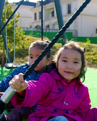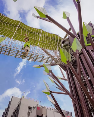 If you pass by Ramsden Park at mid-day, you will find it packed with families. The park's new playground has play zones that offer age-appropriate play for all children. Located in the middle of the playground, the large customized Corocord tower is the draw for the older children. Climbing through its infinite net of ropes offers a fun challenge that has the ultimate reward of a fast trip down the slide. Leading up to the Corocord tower are long tracks of agility nets that offer vertical climbing and intense development of balance and coordination skills. Various springers and seesaws with playful designs will give children of all ages hours of rocking fun, either alone or with friends. The Supernova offers a fun challenge for older children looking to take spin with friends.
