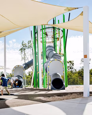 Googong is a recently built city located in Canberra’s outer suburbs. The unique and custom made “Gumnuts playground” was built to attract new residents to the new development. The developers chose to partner with KOMPAN, based on KOMPAN’s ability to design and construct a unique architectural landmark. The area of the playground was once an important meeting place for the traditional landowners, and it has now become the heart of the new city. The custom Corocord “Gumnuts” was designed to pay homage to the surrounding environment, as well as the traditional landowners, as it references the gumnuts and gum blossoms of the native gumtrees. Upon completion, the park was named Yerradhang Nguru Park, in recognition of the Ngunawal people who were the traditional custodians of the land.