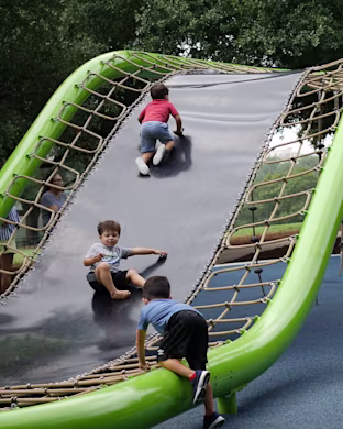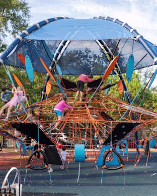 If you pass by Ramsden Park at mid-day, you will find it packed with families. The park's new playground has play zones that offer age-appropriate play for all children. Located in the middle of the playground, the large customized Corocord tower is the draw for older children. Climbing through its infinite net of ropes offers a fun challenge that has the ultimate reward of a fast trip down the slide. Leading up to the large structure are long tracks of agility nets that offer vertical climbing and intense development of balance and coordination skills. Various springers and seesaws with playful designs will give children of all ages hours of rocking fun, either alone or with friends. The Supernova offers a fun challenge for older children looking to take a spin with friends.