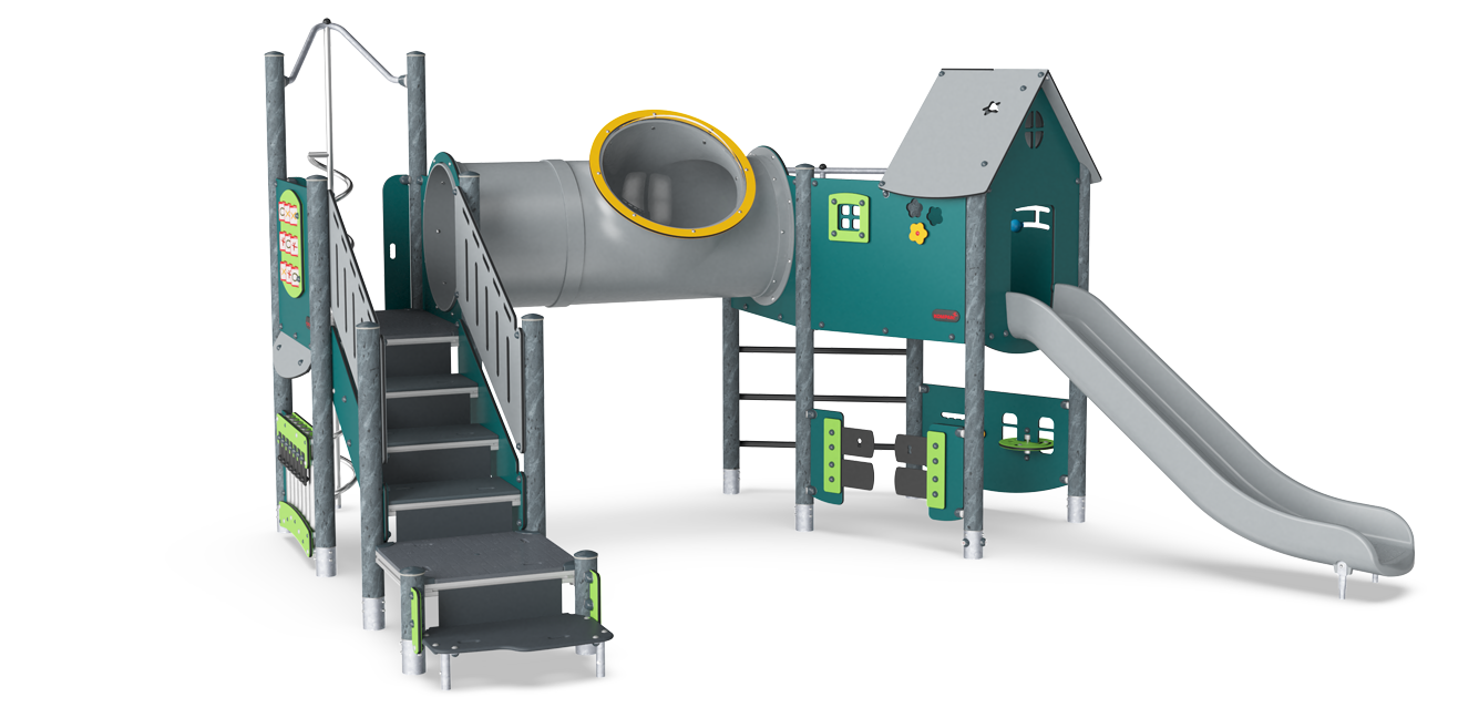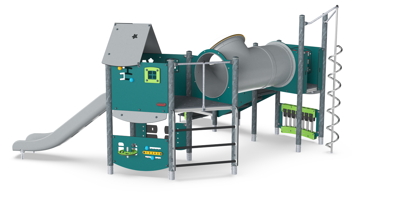 This Angled double tower will attract children to explore, socialize and develop in active outdoor play. The sturdy stairway and the tunnel support climbing, crawling, and cross-coordination. This stimulates cross-modal perception, important for reading. The bubble window in the tunnel bridge distorts voices when spoken into, evoking a sense of wonder and training logical thinking. On the elevated level, there are three ways to exit the unit; a slide, a curly climber, and a pipe climber, which will support children in thrill-seeking and physical decision making. Sliding and gliding support posture and balance, important skills for navigating the world securely. On ground level, inviting play spaces with rich play panels stimulate cause-and-effect understanding, both in a tactile and auditive manner. These spaces encourage social and dramatic play, supporting language development.