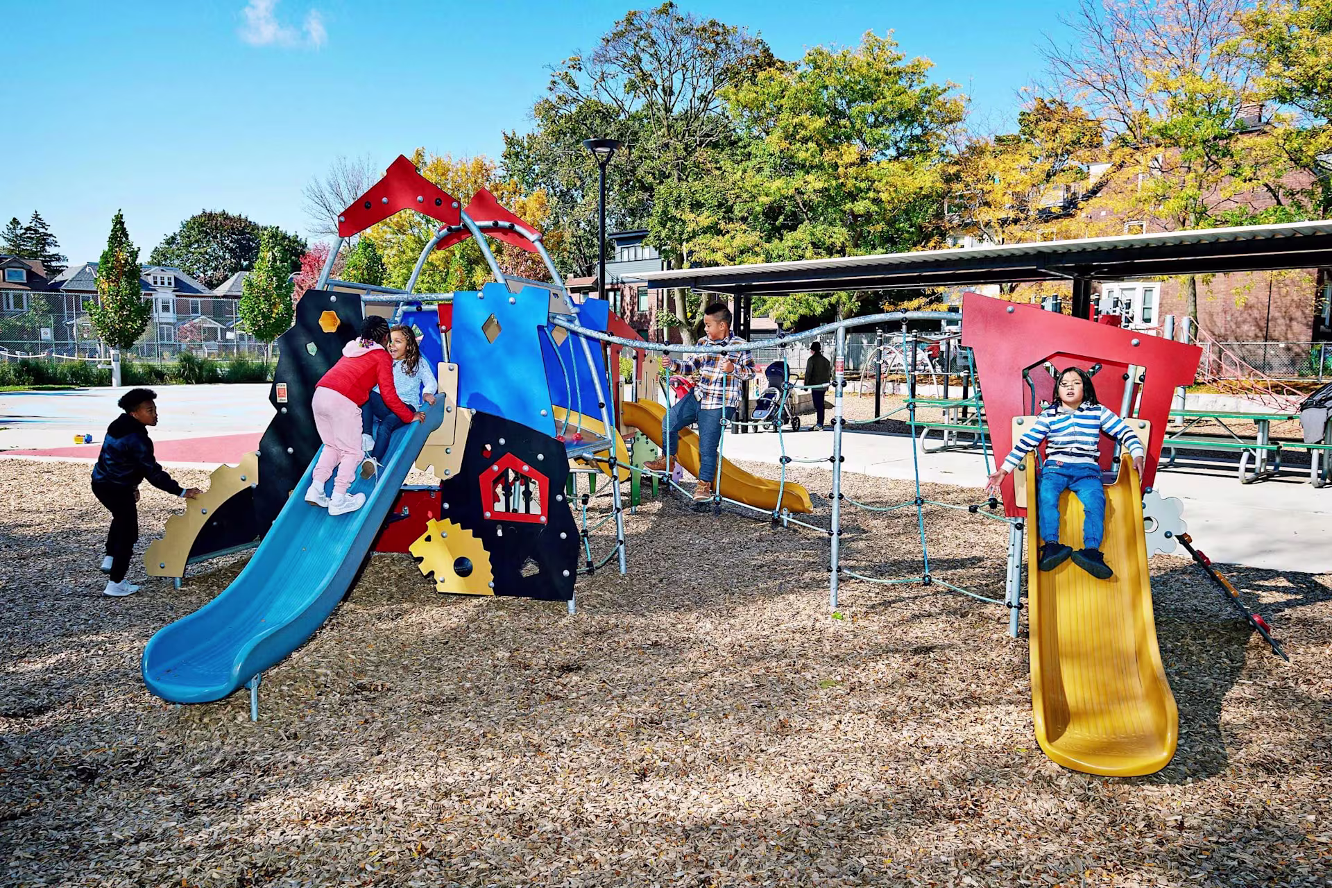 El resultado es un parque infantil artístico, que por su diseño crea espacio para muchos niños en un área pequeña. Gracias a su arquitectura abierta, los padres pueden disfrutar de conciertos en el teatro y al mismo tiempo vigilar a sus hijos. A la comunidad le encanta el parque infantil, y la ciudad está satisfecha con el equipamiento de alta calidad y el buen servicio, ya que no necesita mantenimiento.