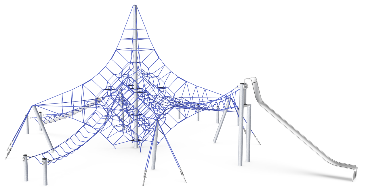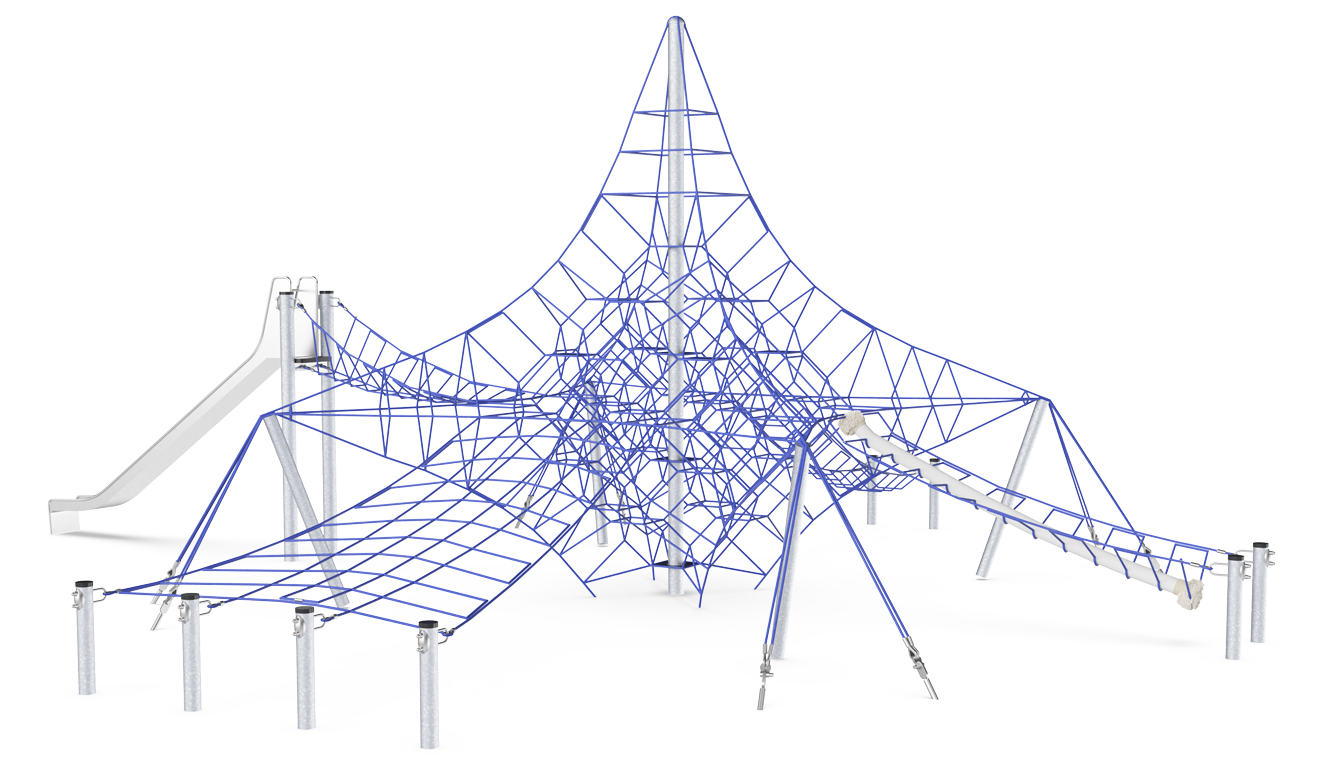 La Gran Red Octa hace que los niños se queden boquiabiertos. Motiva el juego y las revisitas con su multitud de diversión de escalada densa y saltarina. La ruta saltarina hasta la cima es un gran desafío y proporciona a los usuarios una fuerte sensación de logro cuando alcanzan la cima del mástil y disfrutan de la vista de toda la zona. Trepar por la red entrena los principales grupos musculares y habilidades motrices como la coordinación cruzada y el equilibrio, que también son cruciales para la capacidad de concentración de los niños. Cuando los niños necesitan un descanso, pueden socializar en las membranas, entrenando las habilidades de turnarse y negociar. El tobogán es una salida divertida de las redes. El bucle por la cuerda de coco o la escalera de cuerda a través de la red, bajando por el tobogán, es un bucle que atraerá una y otra vez, durante mucho tiempo.
