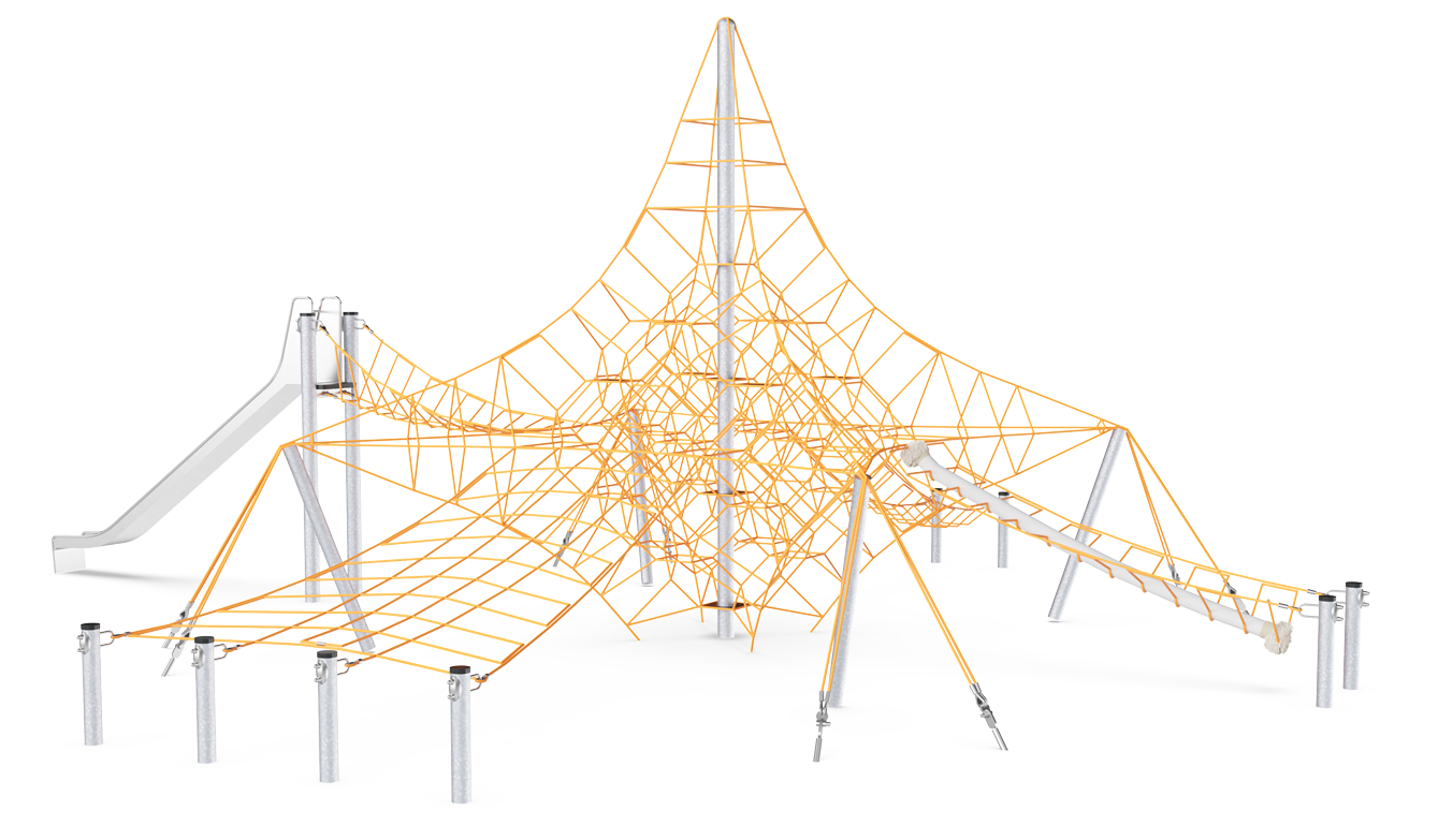 La Gran Red Octa hace que los niños se queden boquiabiertos. Motiva el juego y las revisitas con su multitud de diversión de escalada densa y saltarina. La ruta saltarina hasta la cima es un gran desafío y proporciona a los usuarios una fuerte sensación de logro cuando alcanzan la cima del mástil y disfrutan de la vista de toda la zona. Trepar por la red entrena los principales grupos musculares y habilidades motrices como la coordinación cruzada y el equilibrio, que también son cruciales para la capacidad de concentración de los niños. Cuando los niños necesitan un descanso, pueden socializar en las membranas, entrenando las habilidades de turnarse y negociar. El tobogán es una salida divertida de las redes. El bucle por la cuerda de coco o la escalera de cuerda a través de la red, bajando por el tobogán, es un bucle que atraerá una y otra vez, durante mucho tiempo.