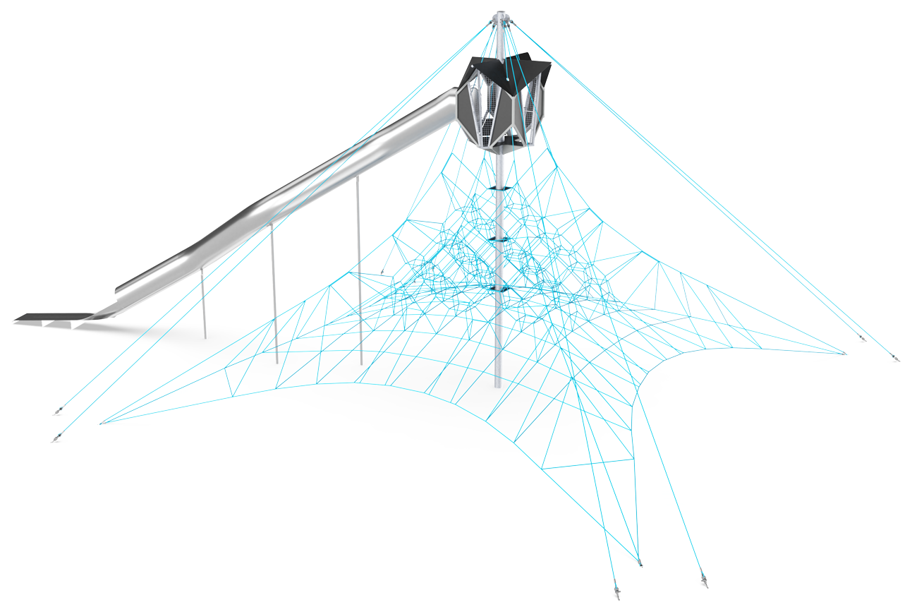 Las cuerdas de apoyo principales de las redes tridimensionales están equipadas con una característica de seguridad adicional: si las conexiones principales fallan, la cuerda de seguridad evita el colapso de la estructura.