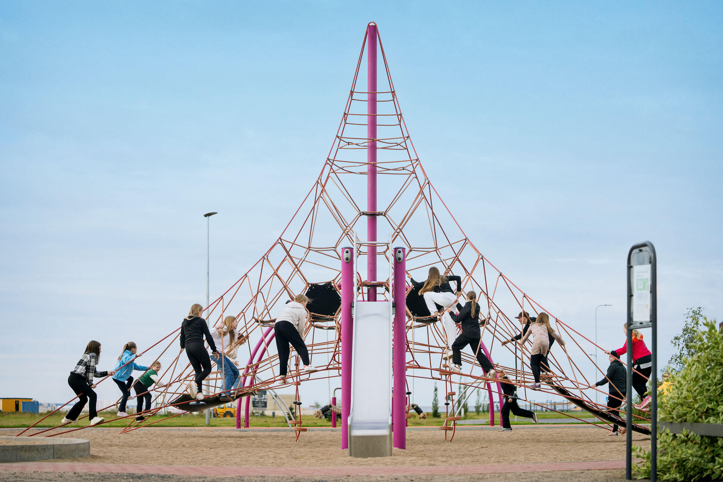 Kun 20 vuotta vanha leikkipaikka tarvitsi päivitystä, toiveena oli köysikiipeilyleikkipaikka, jossa olisi "WOW!" -tekijä. Puisto sijaitsee lähellä koulua, ja leikkipaikka on rakennettu houkuttelemaan kouluikäisiä lapsia heidän taidoistaan riippumatta. Esteettömien alueiden ansiosta, jotka eivät vaadi kiipeilyä, kaikki voivat nauttia kuutiotornista avautuvasta näkymästä.