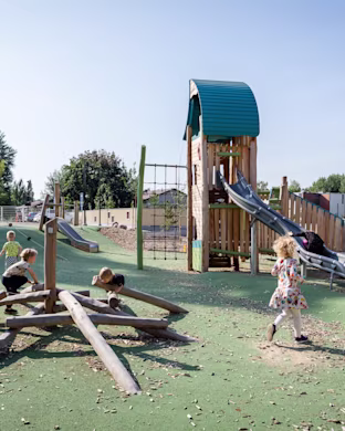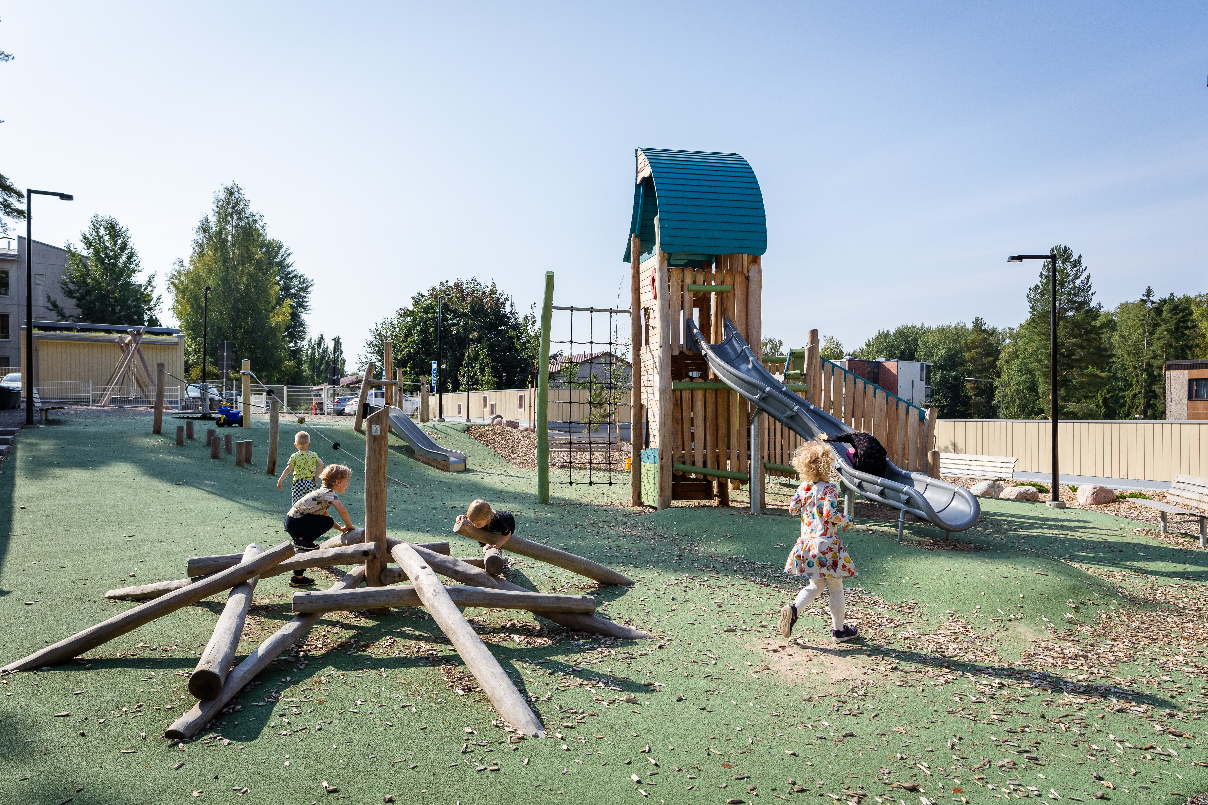 Valinta kohdistui KOMPANin luonnonmukaiseen Robinia-sarjaan, jonka orgaaninen puuilme ja laaja valikoima välineitä tukevat lasten kokonaisvaltaista kehitystä. Kiipeilytelineet, tasapainoradat ja liukumäet tarjoavat vauhdikasta tekemistä, kun taas leikkimökit, hiekkaleikit ja leikkipaneelit kutsuvat rauhallisempiin mielikuvitusleikkeihin.