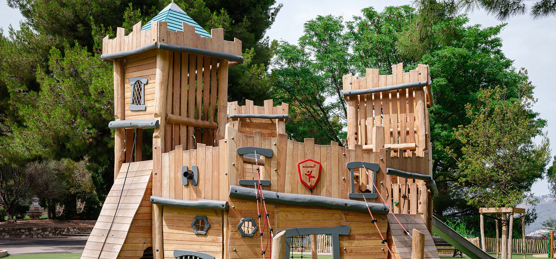 Le château impressionne les parents et les enfants avec sa taille énorme et ses nombreuses possibilités pour des heures de jeux. Il comporte de nombreux éléments différents qui permettent aux enfants d'âges différents de jouer dessus. Le château de l'aire de jeux invite au jeu dramatique où les jeunes chevaliers et princesses peuvent envahir le château à l'aide des filets d'escalade menant à la tour. Lorsqu'ils atteignent le sommet, une glissade sur le grand toboggan les attend! Le château défie les compétences physiques telles que la coordination croisée, l'équilibre et la conscience spatiale. Les compétences socio-émotionnelles sont également soutenues par le jeu, comme la coopération et le développement du langage.