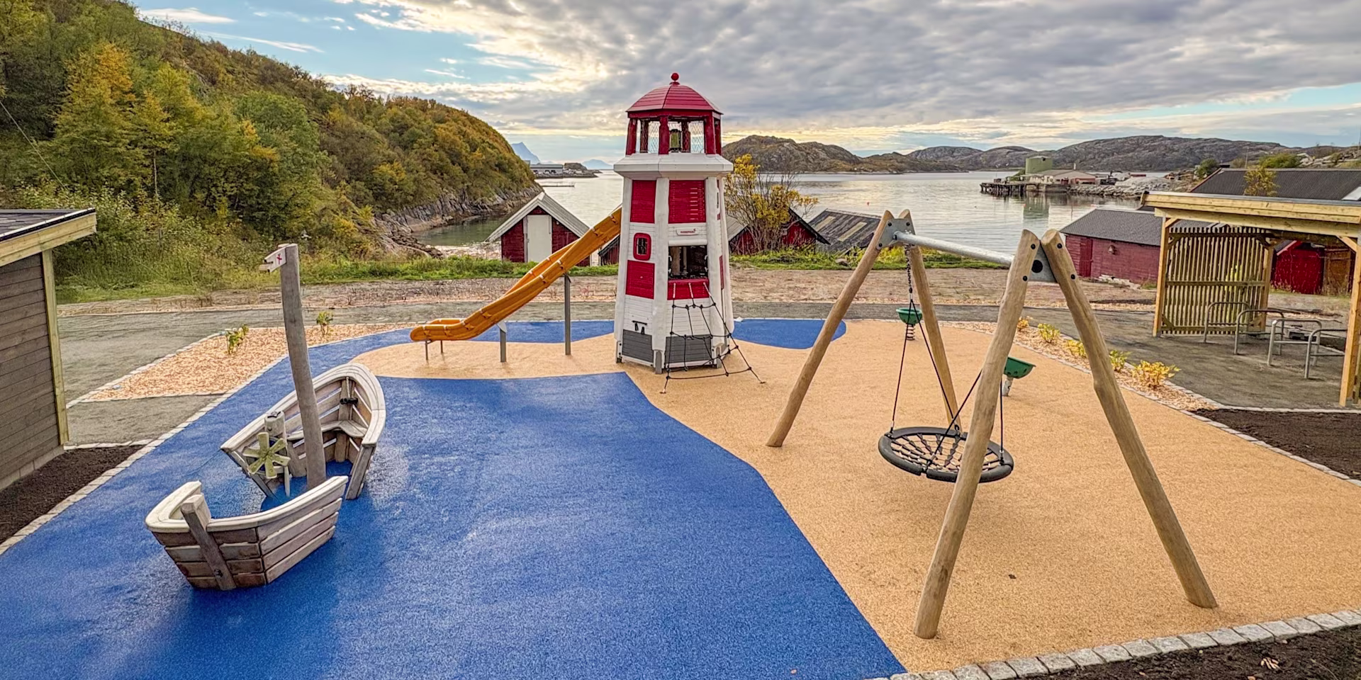 Lekeplassen er utformet med tanke på både lek og landskap, og ligger kun noen meter fra stranden. Her kan barna leke med vinden i håret og lyden av bølger i bakgrunnen, mens voksne nyter utsikten eller samles rundt grillplassen. Dette unikt designede tårnet er spesialtilpasset Kvalvika, og smelter sømløst inn i omgivelsene med sin maritime estetikk. På siden ligger en liten båt fortøyd, klar til å ta barna med på nye eventyr når de har utforsket alle kriker og kroker i fyrtårnet.