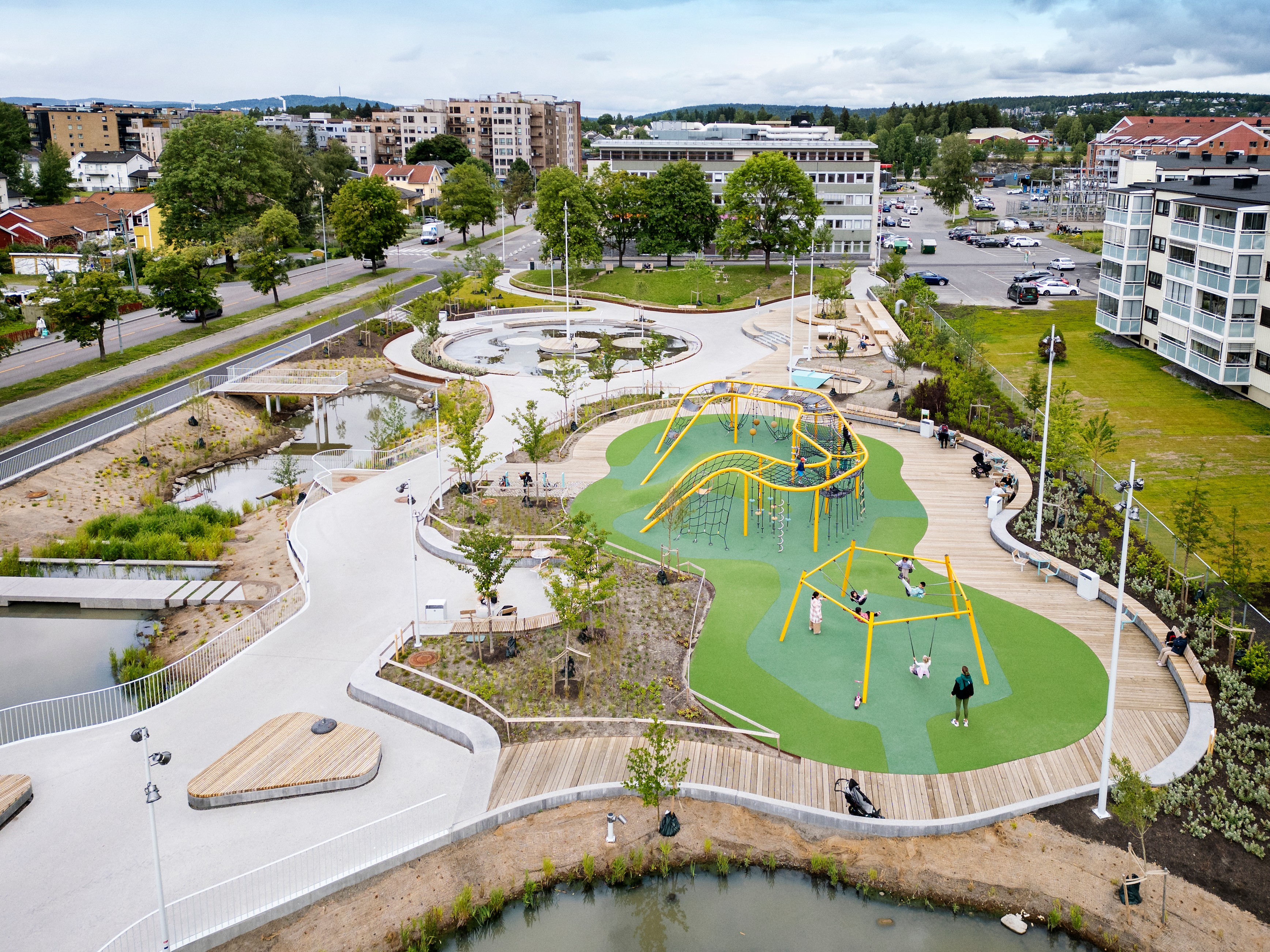 "Da vi tok kontakt med Kompan, startet en inspirerende og dynamisk prosess med idéutveksling og utvikling. KOMPAN bidro både kreativt og teknisk, og sammen fant vi frem til en løsning som var både stilig og byggbar. KOMPAN bisto med forslag til design, sammensetning av apparater, innfestningsløsninger, m.m. I tillegg til at apparatene måtte være av høyestekvalitet ble også øvrig design viktig for å skape et spennende, attraktivt og lunt miljø. Fargevalg ble nøye vurdert—ikke bare på lekestrukturene, men også i tak og på dekket. I tillegg la vi stor vekt på materialvalg og en gjennomtenkt belysningsplan, som bidrar til både atmosfære og funksjonalitet.