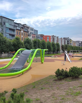 De landschapsarchitect achter de nieuwe speeltuin in Ramsden Park, toronto, zijn visie was om iets nieuw en uitdagend te creeëren, maar wou daarbij ook iets oud integreren. Met iets oud bedoelde ze zowel het verwerken van het erfgoed van de stad en enkele favoriete speeltuigen van de bestaande KOMPAN speeltuin. De nieuwe speeltuin gebruikt gele kleuren en thema's gelinkt aan de geschiedenis van steen in Toronto. Er zijn verschillende tijdloze speeltoestellen van de oude speeltuin, zoals de iconische Crazy Hen, bewaard gebleven. Na jaren plezier te geven op zijn vorige locatie, zijn de eerste revolutionaire springers nog steeds in goede vorm en werden ze deel van de nieuwe speeltuin.