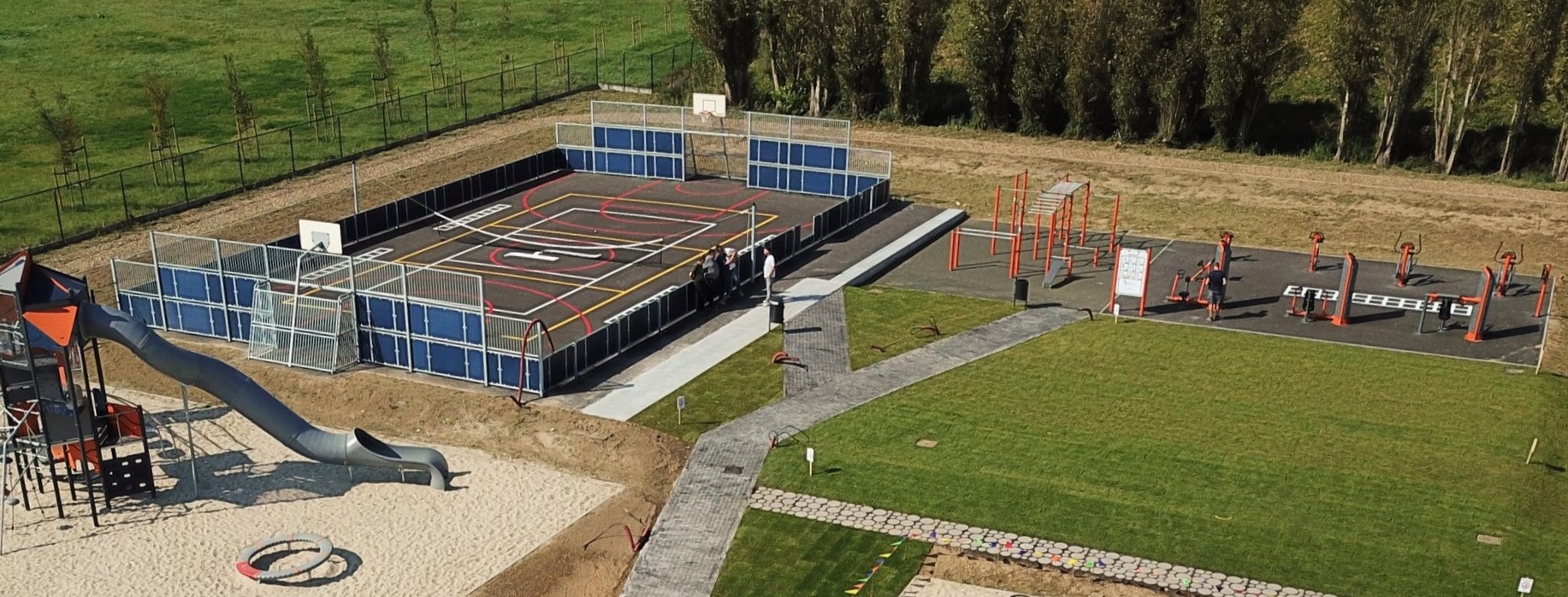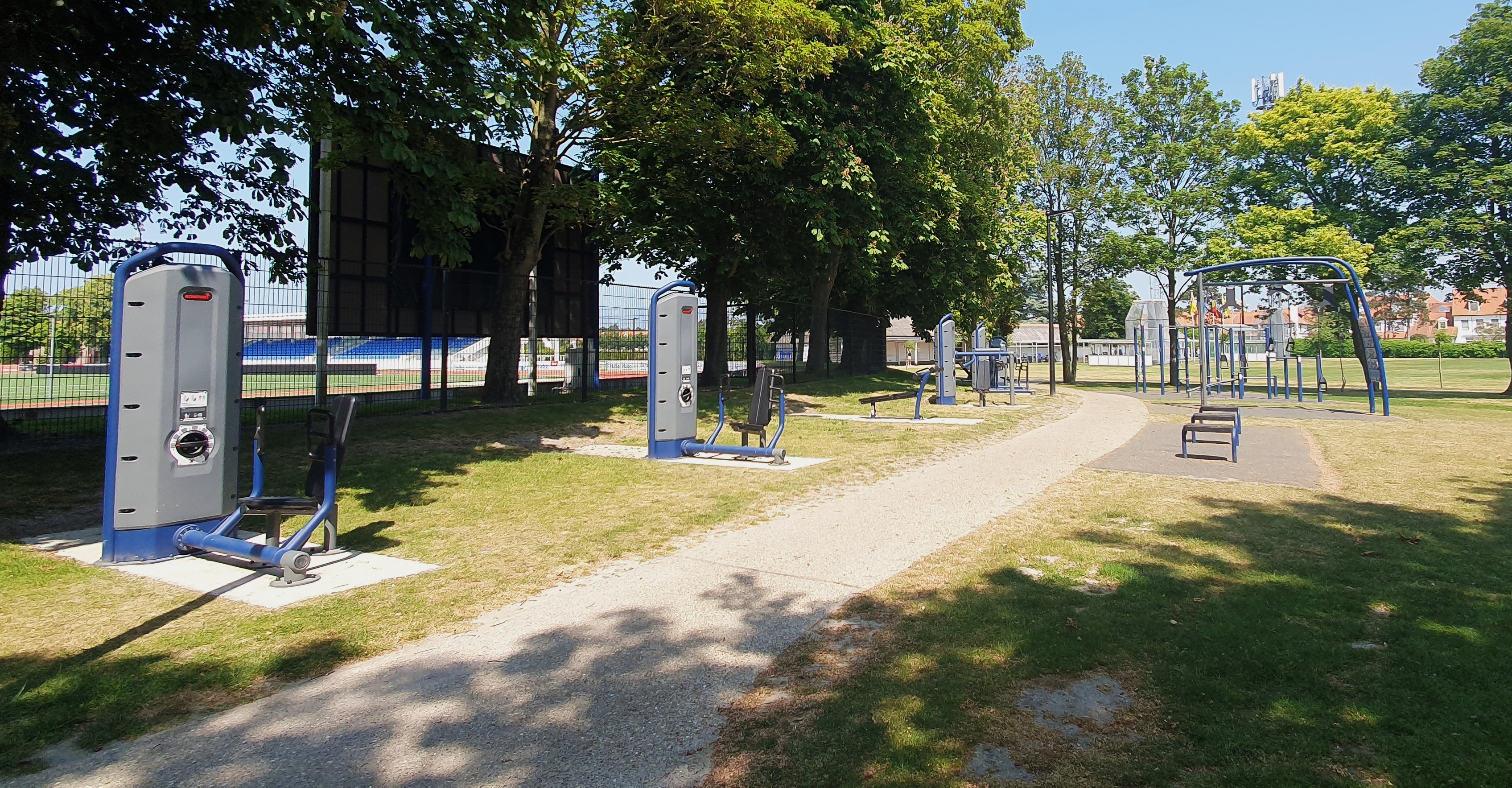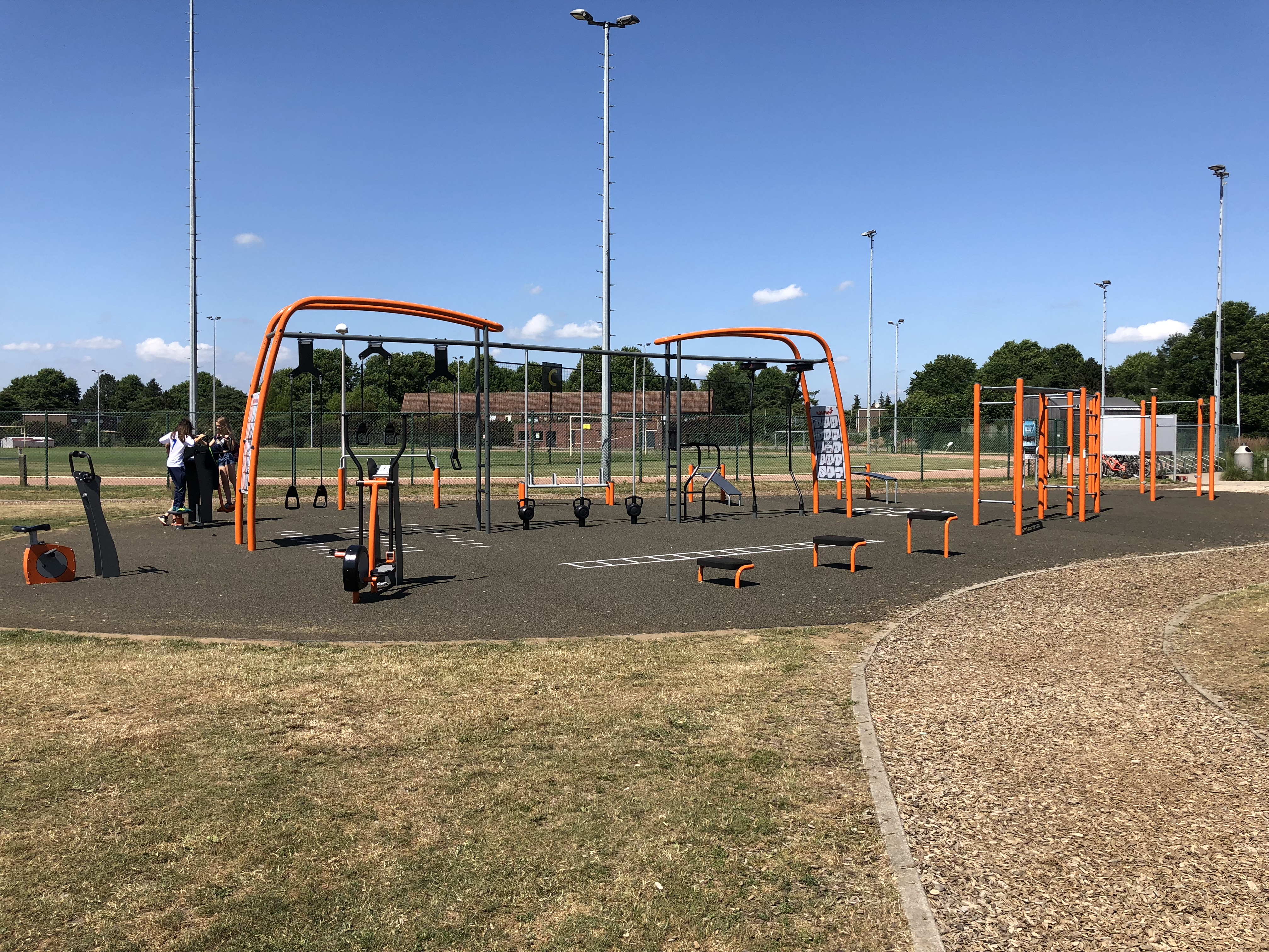 Ook staan hier een vijfhoekige trainingsset, Dip Bench toestellen, twee rekken op verschillende hoogtes voor push-ups, drie Parallel Bars, en een set van vier steps in verschillende hoogtes.
